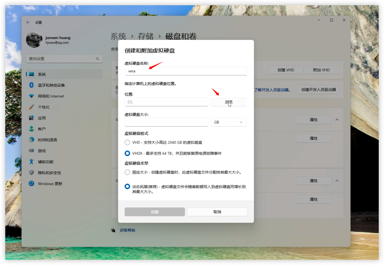 5、虚拟硬盘名称看你喜好随便写,这里的名字会在你的NAS盘上创建一个该名称的文件。然后点击浏览选择将这个虚拟盘放在什么位置