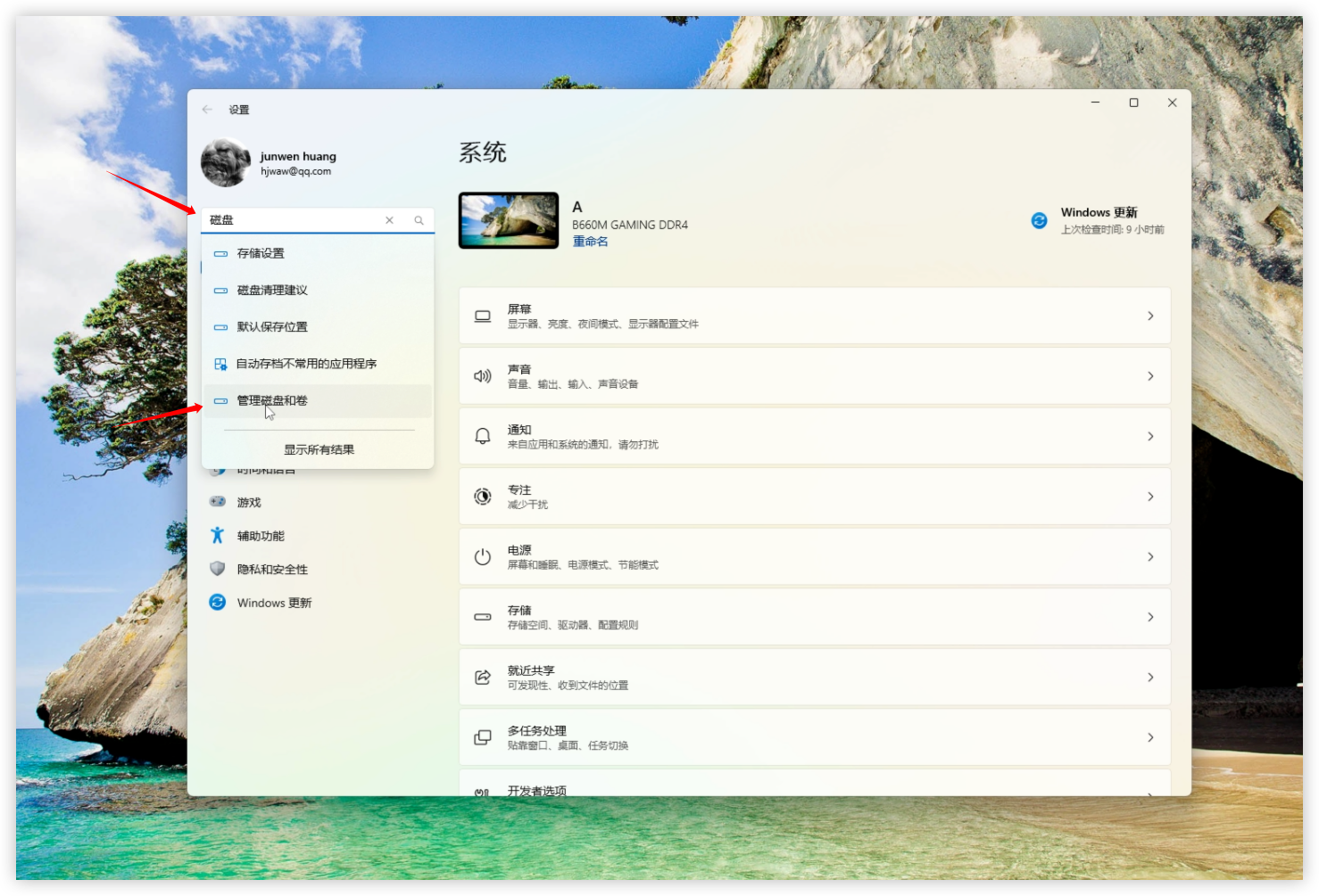3、进入管理磁盘和卷:搜索框输入“磁盘”