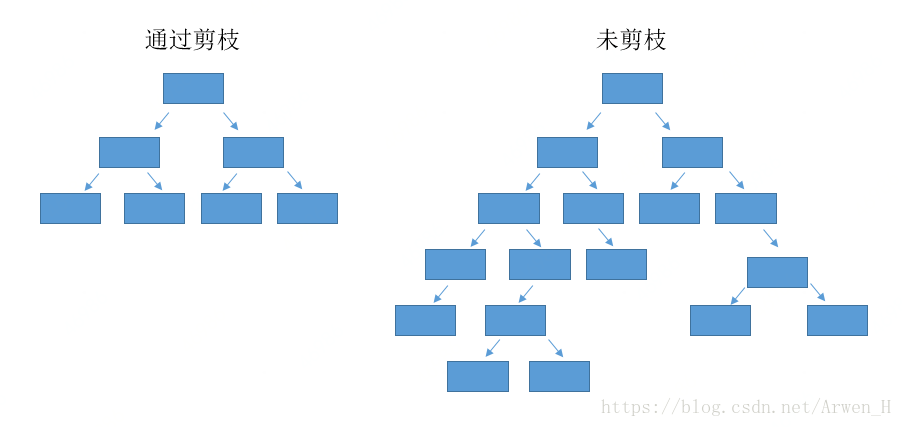 后剪枝:当建立完决策树后来进行剪枝操作,通过一定的衡量标准(叶子节点越多,损失越大)