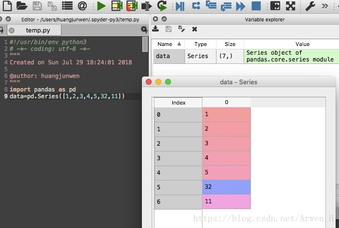 data=pd.Series([1,2,3,4,5,32,11]) #创建一个series类型的数据
