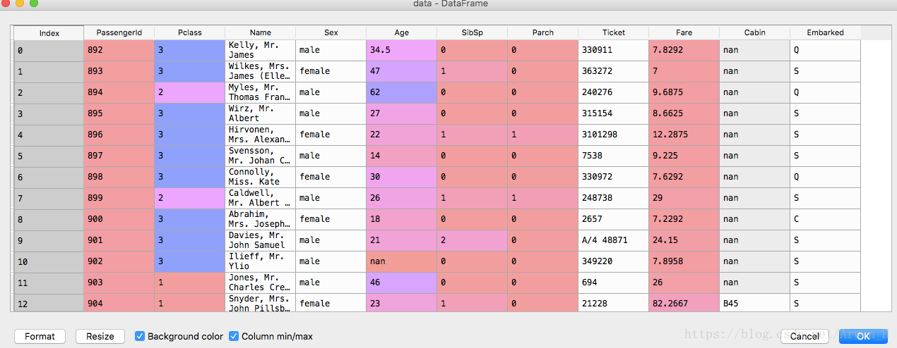 data.columns=['乘客','类型','姓名','性别','年龄','关系','Parch','船票','票价','船舱','登船口']#把所有列名换成中文名字,有一个parch不知道是什么意思理解不了